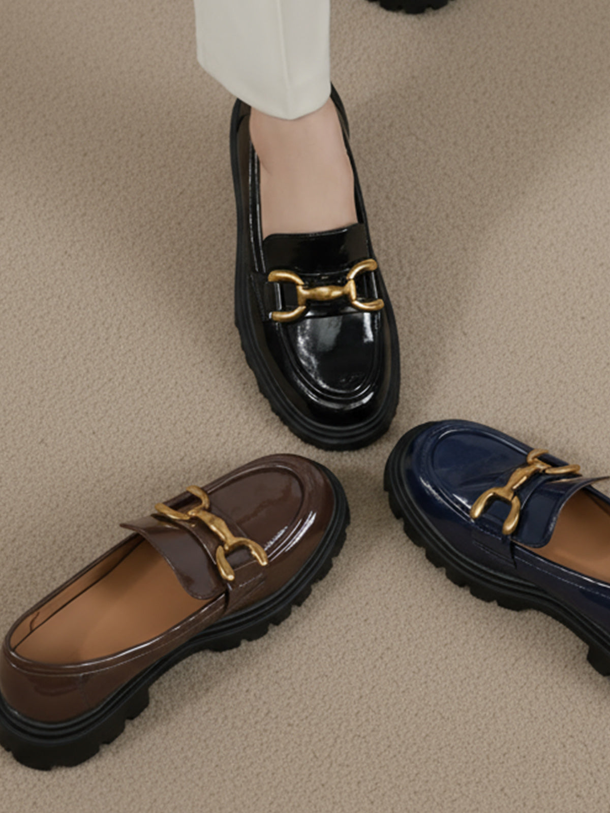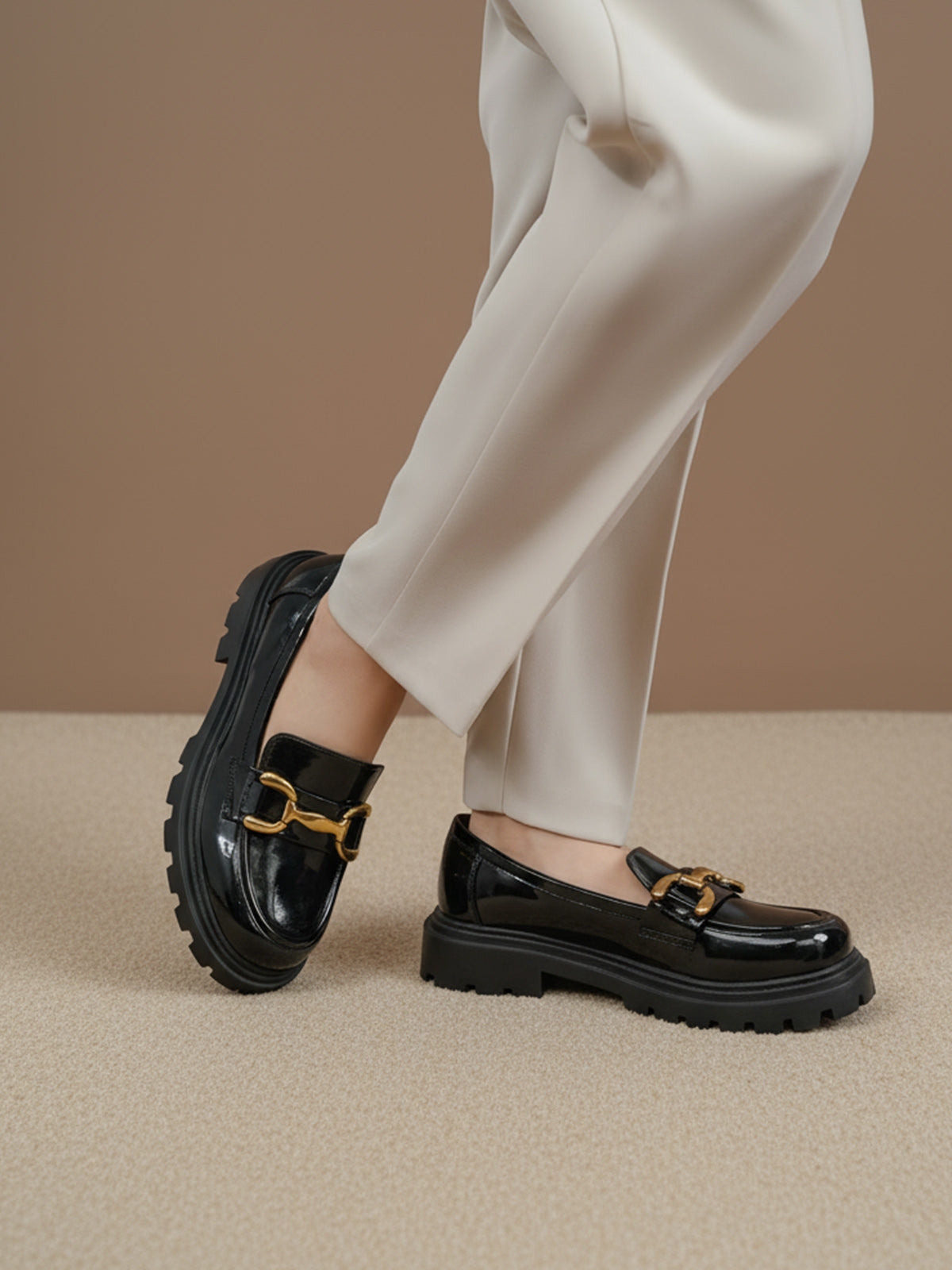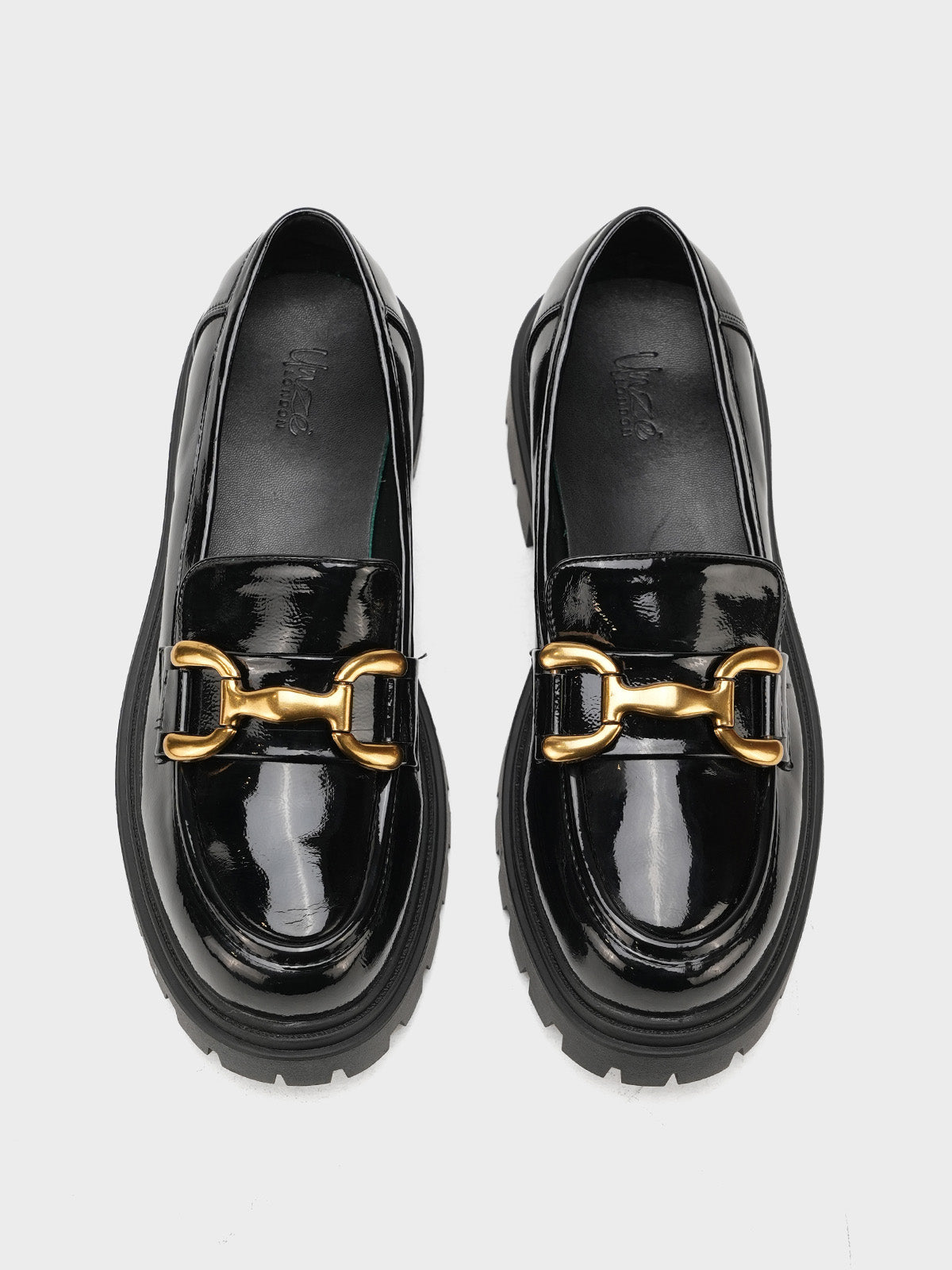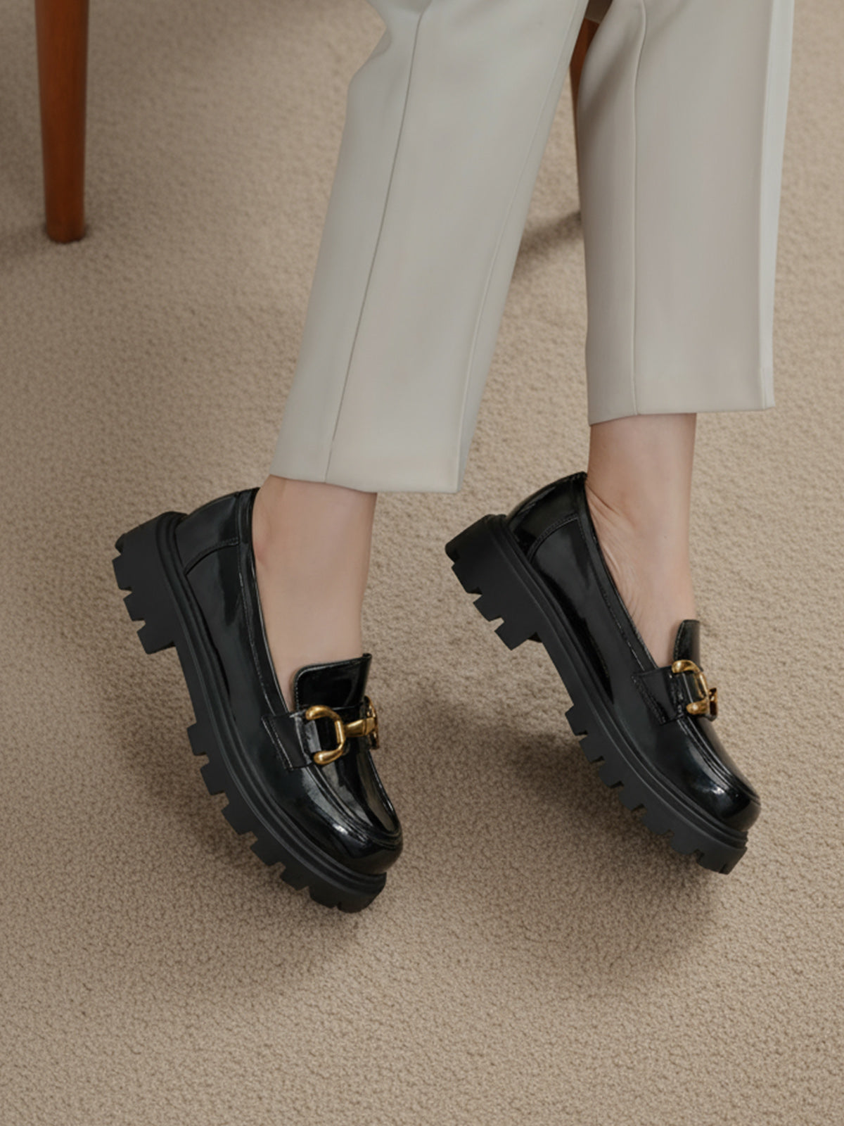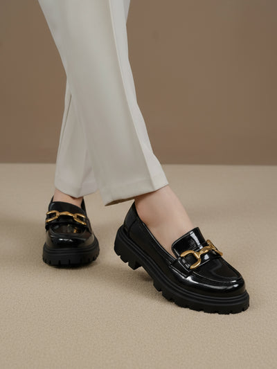 Elevate your everyday look with these stylish women’s loafers. Featuring a glossy finish and chunky sole for extra grip and height, these loafers combine fashion with function. The bold gold chain detail adds a touch of elegance, making them perfect for both casual and semi-formal outfits.