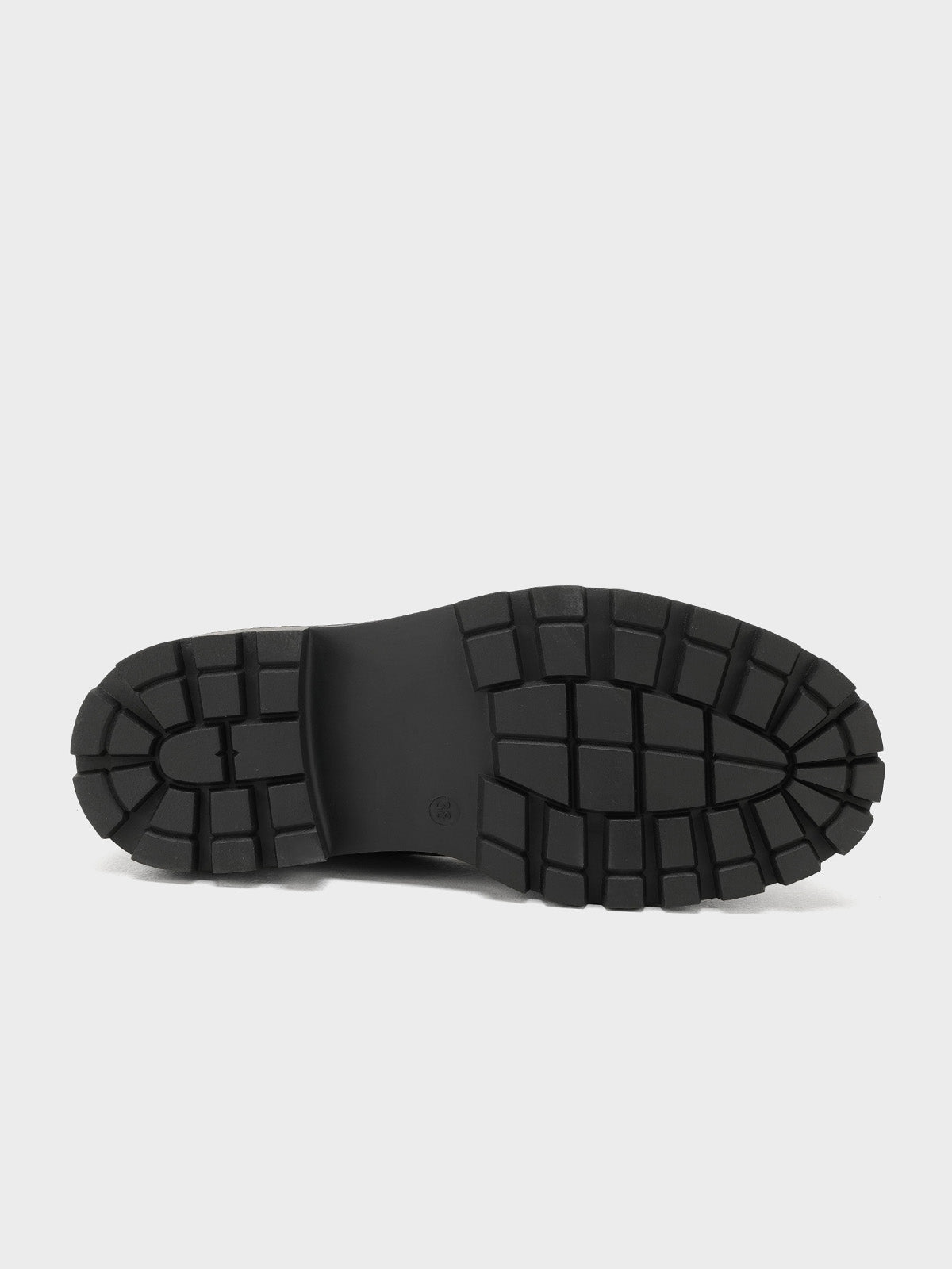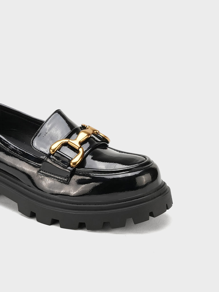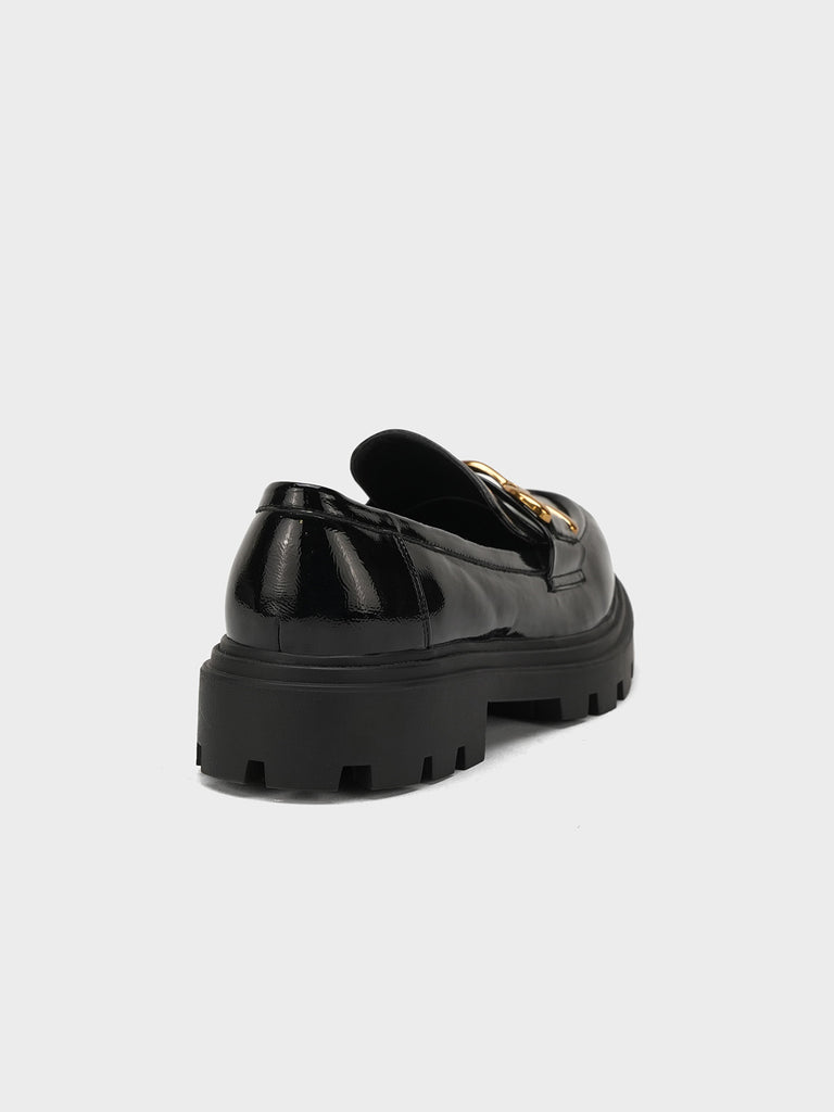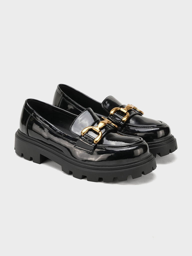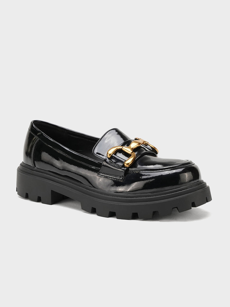 Elevate your everyday look with these stylish women’s loafers. Featuring a glossy finish and chunky sole for extra grip and height, these loafers combine fashion with function. The bold gold chain detail adds a touch of elegance, making them perfect for both casual and semi-formal outfits.