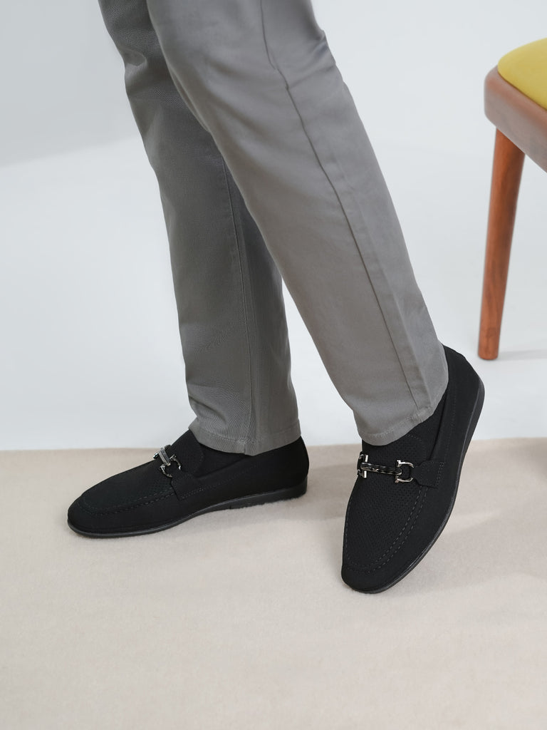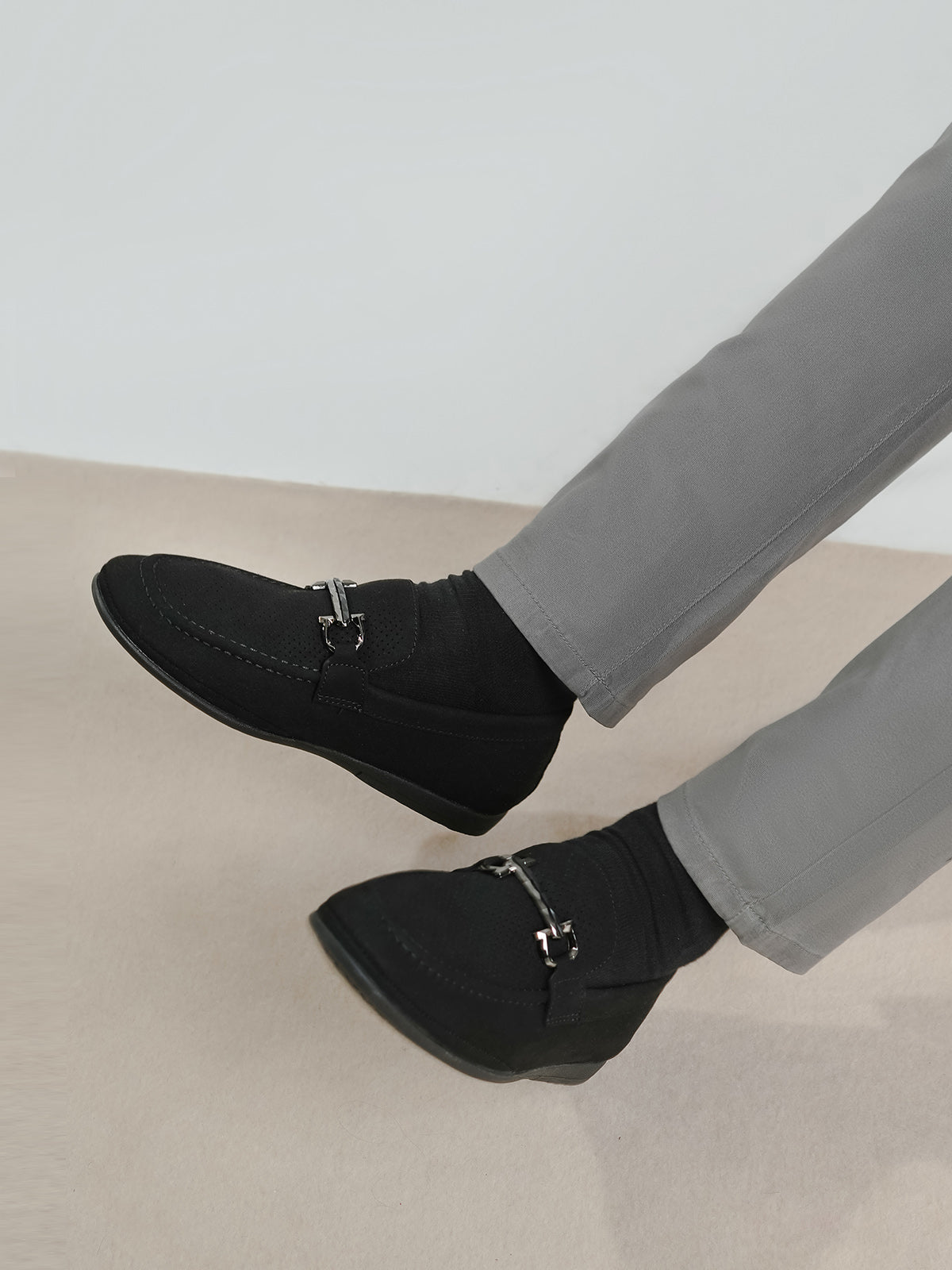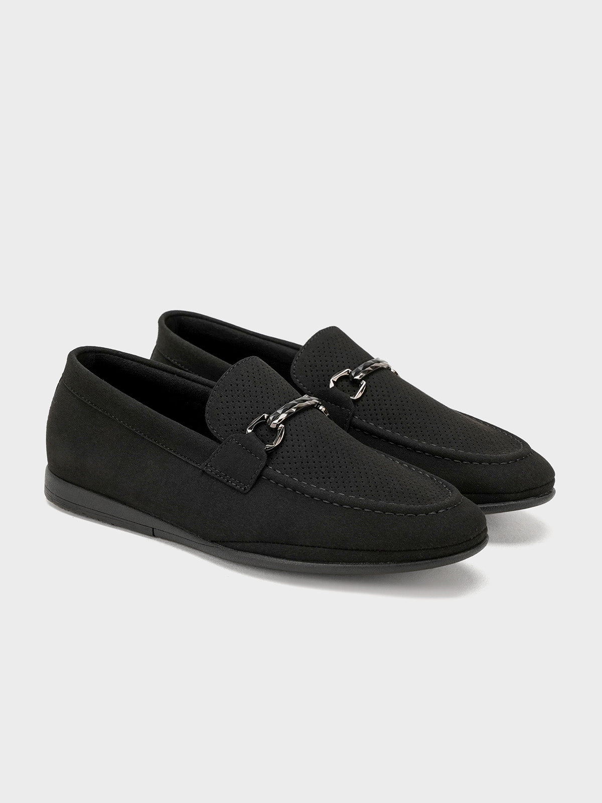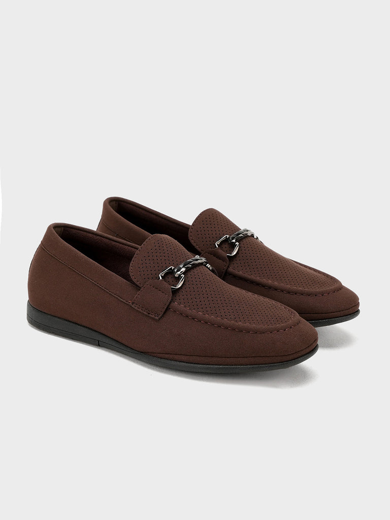 Add timeless charm to your look with these men’s loafers featuring a sleek metal buckle detail. Crafted from soft, durable material with a perforated upper for breathability, these loafers offer both comfort and style.