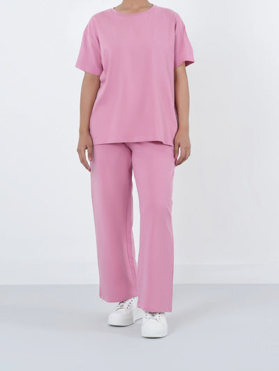 Women's co-ord set made from jersey and terry fabric, with options in Lycra Jersey and Lycra Terry. The set includes a basic top and matching wide-leg pants, designed with a regular fit. It's available in solid colors,uitable for casual or lounge wear.