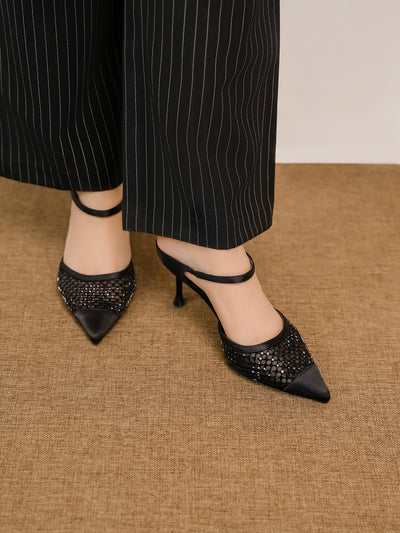 Turn heads with these pointy-toe ankle-strap shoes featuring delicate embellishments, ideal for weddings or special occasions. Its stylish pencil heel and net and PU made upper makes it trendy.