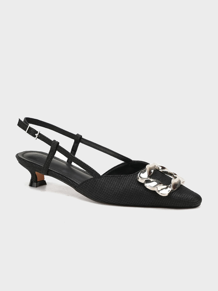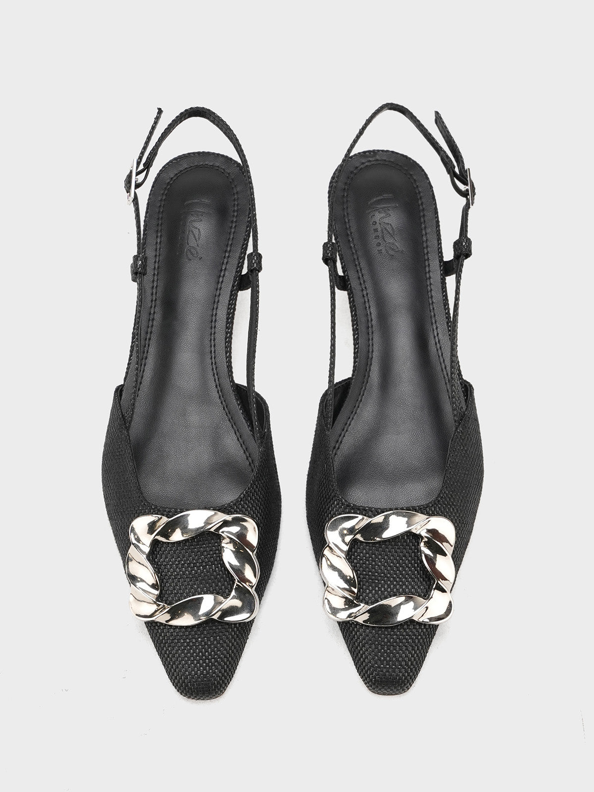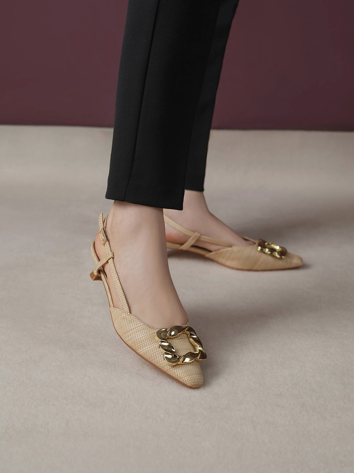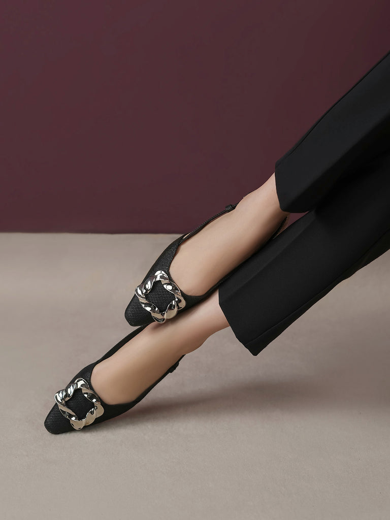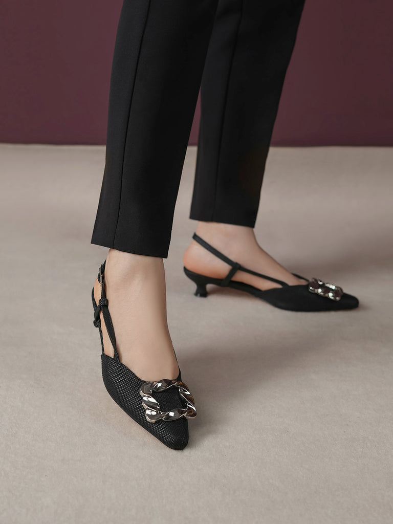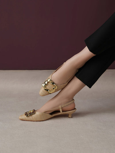 Make a statement with these elegant women’s buckle sandals, designed to add instant glamour to any outfit. Featuring a pointed toe and eye-catching metallic buckle embellishments, the low kitten heel ensures comfort while maintaining a graceful silhouette.