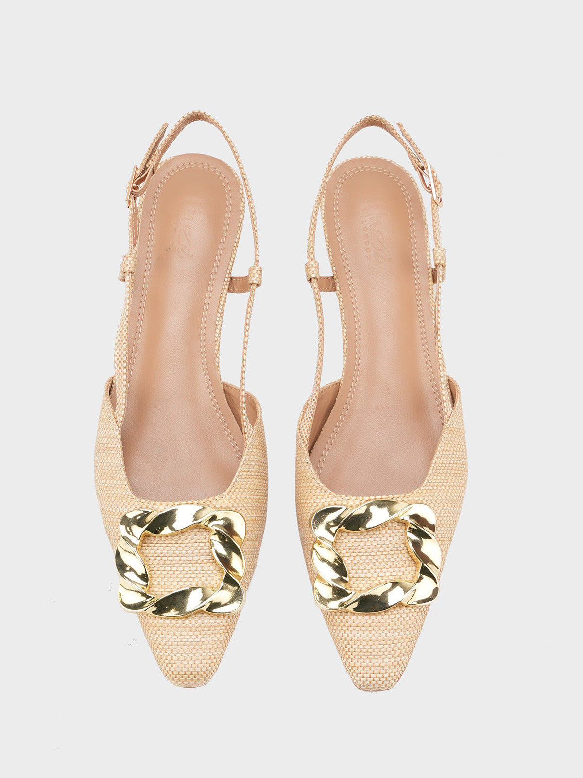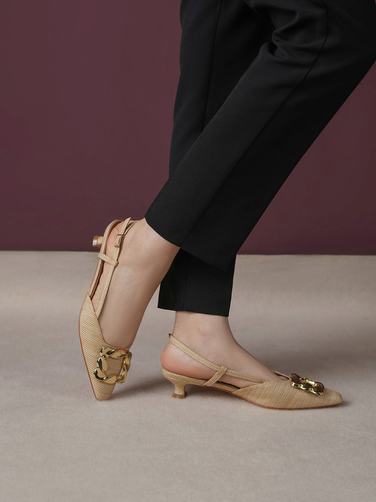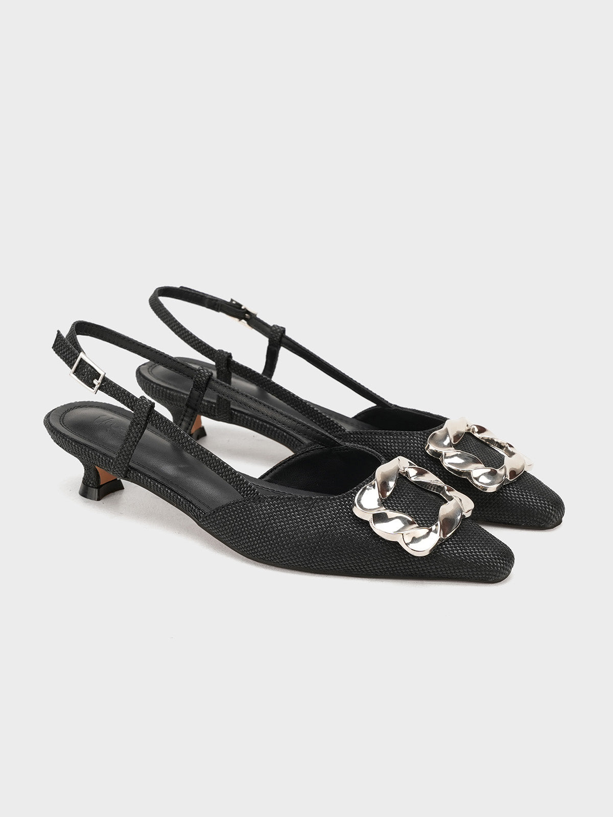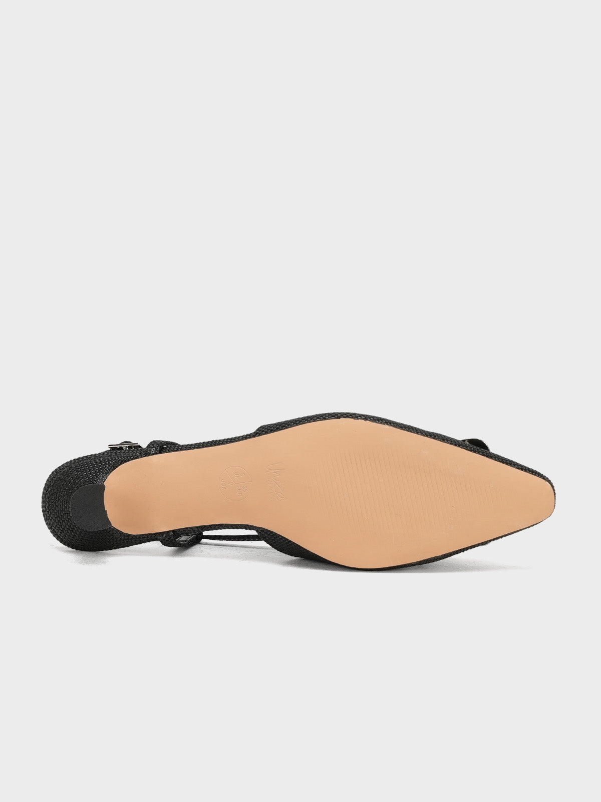 Make a statement with these elegant women’s buckle sandals, designed to add instant glamour to any outfit. Featuring a pointed toe and eye-catching metallic buckle embellishments, the low kitten heel ensures comfort while maintaining a graceful silhouette.