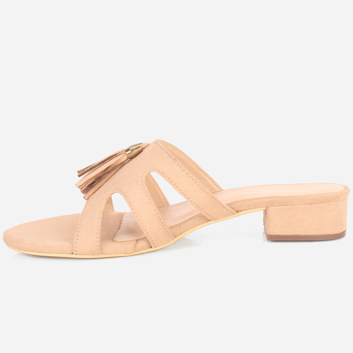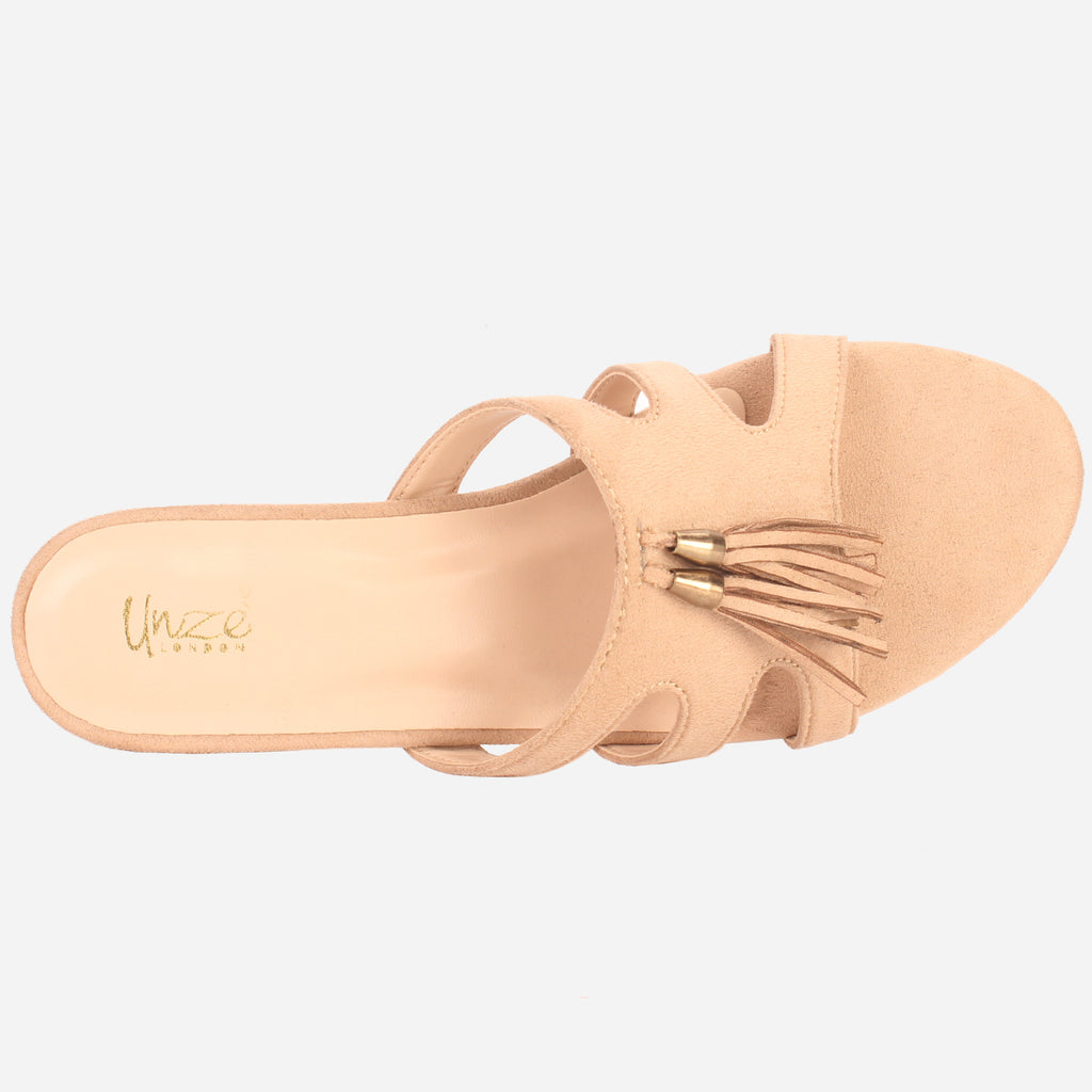 Prepare yourself for those warm weathers vibes with these stylish and comfy summer slippers. This natural, adaptable slide is sure to become a favorite. Convenient slip on style comes for quick on and off. Mid low heel comes along with cushioned footbed and open toe silhouette. Upper is beautifully adorned with trim detailing that makes it more versatile. Suede upper, PU lining and rubber sole makes these slid-in shoes perfect for warm weather.