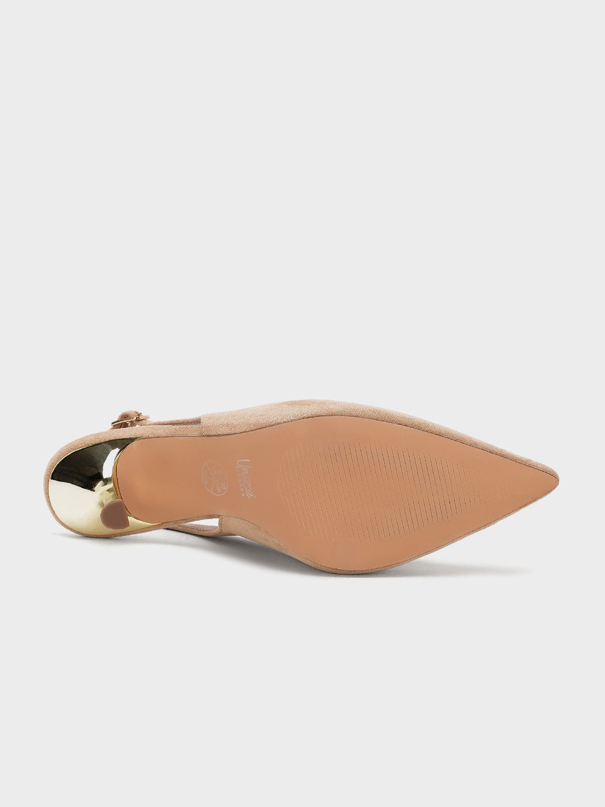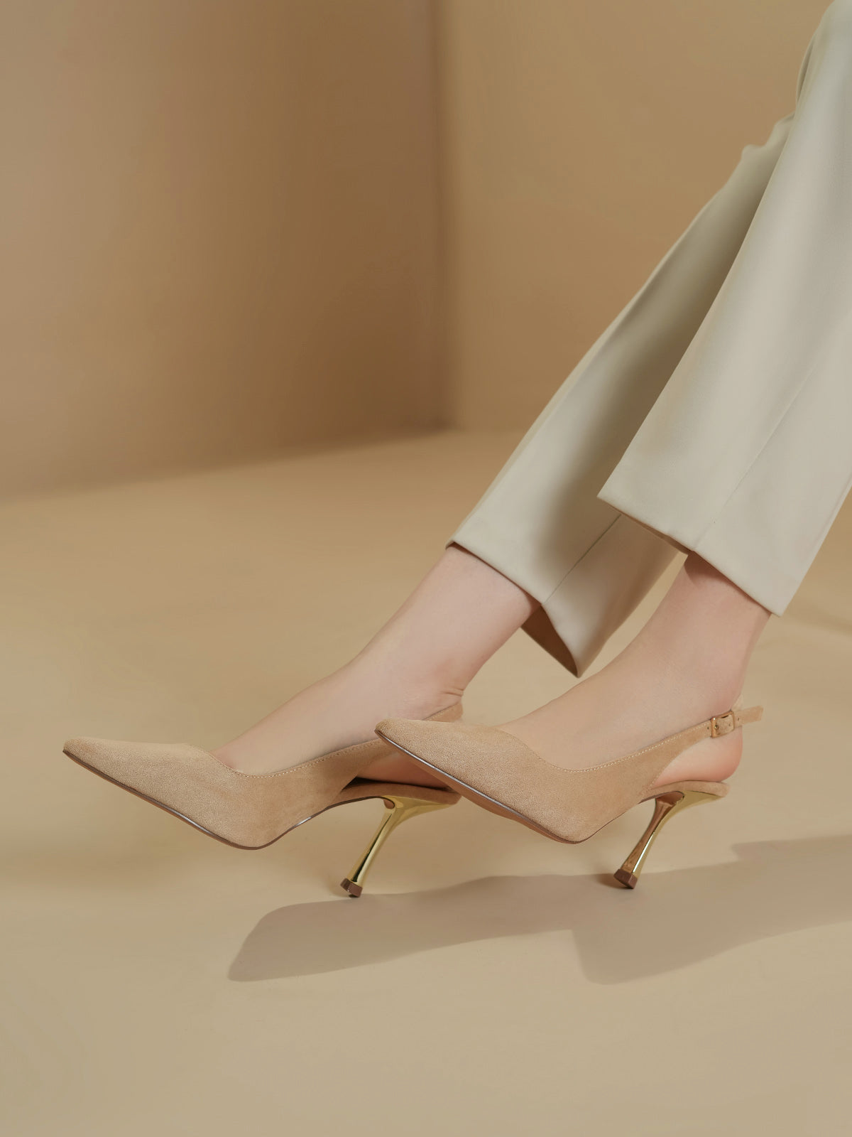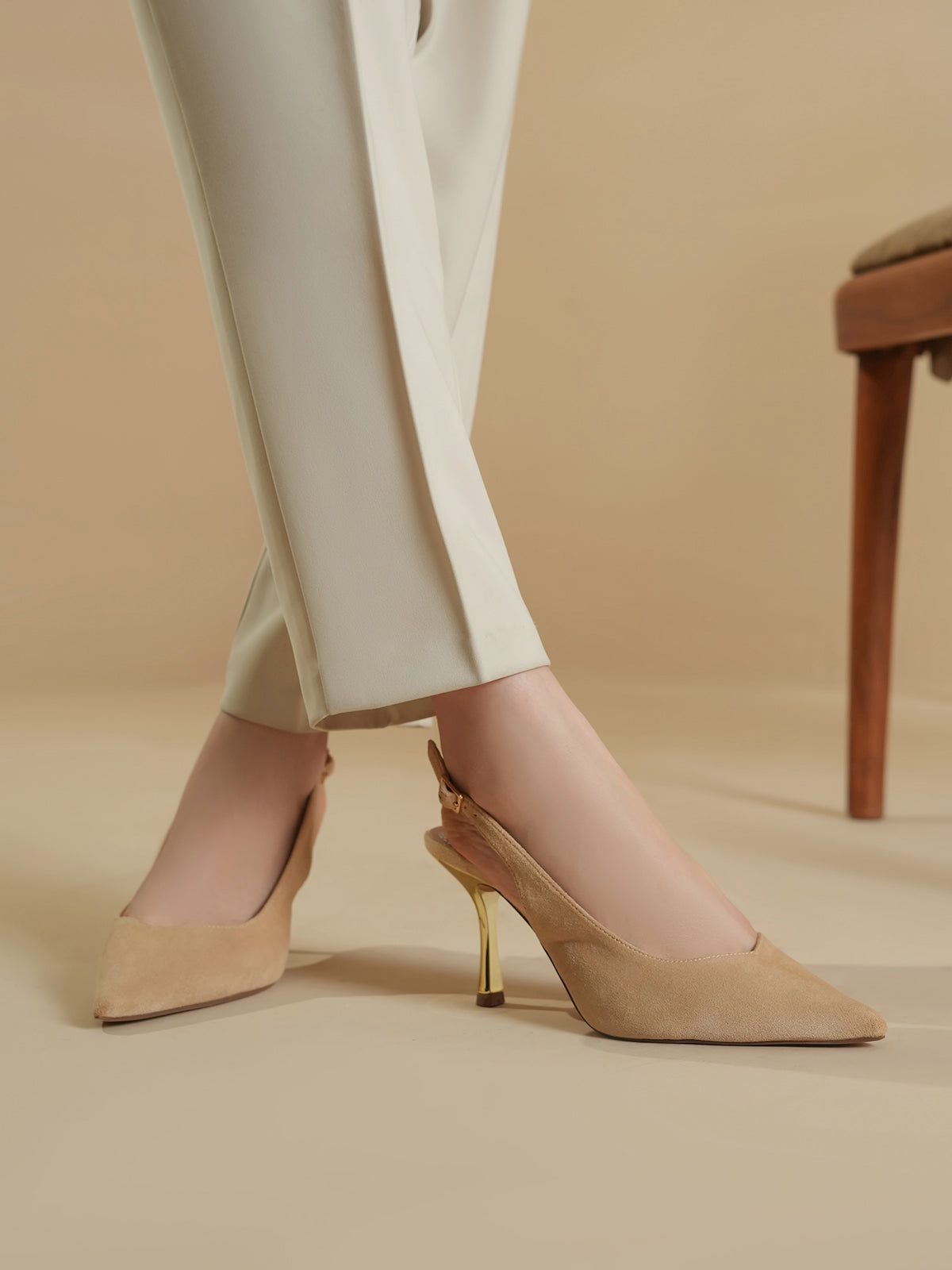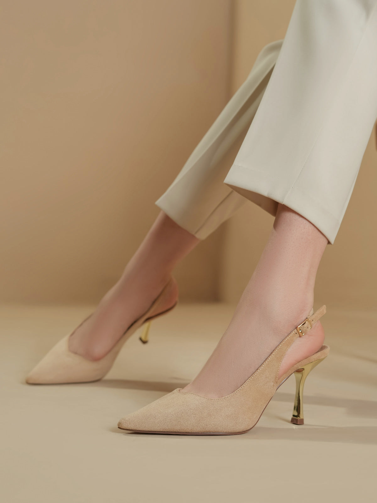 Add elegance to your steps with these pointed-toe women’s sandals featuring a stylish slingback buckle. Crafted in a soft suede finish, they offer a refined look with a sleek stiletto heel for just the right amount of height.