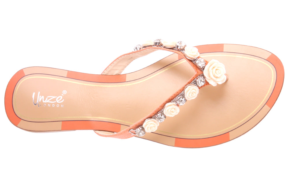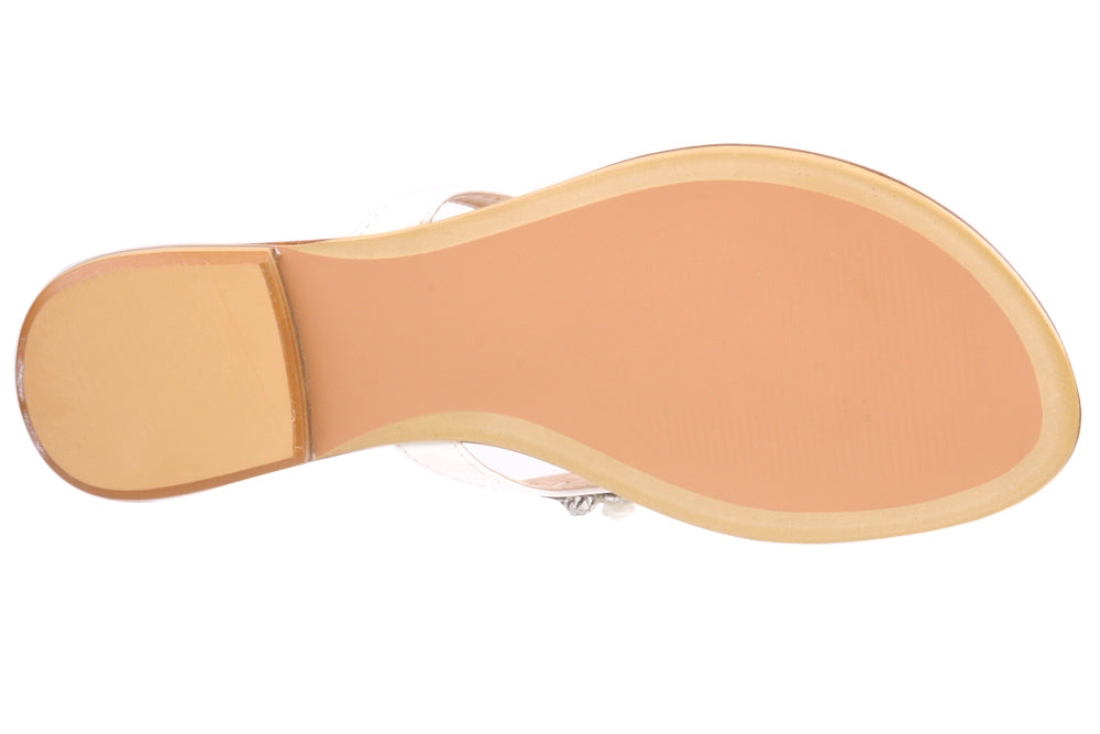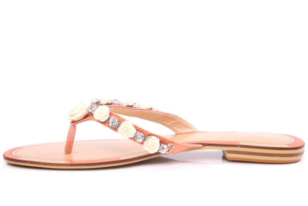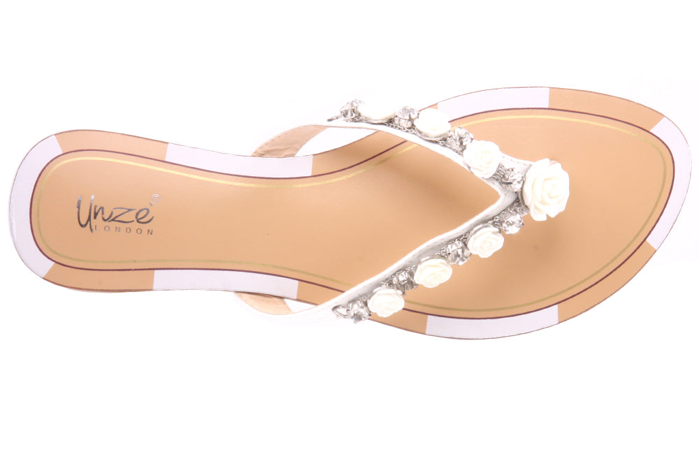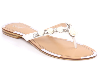 Spring brings colors and fun so these chic floral designed thong slippers. Metallic rose designed buckles adorned the v-bar with easy slipon construction and flat sole. Style No: L24418 Colour: White