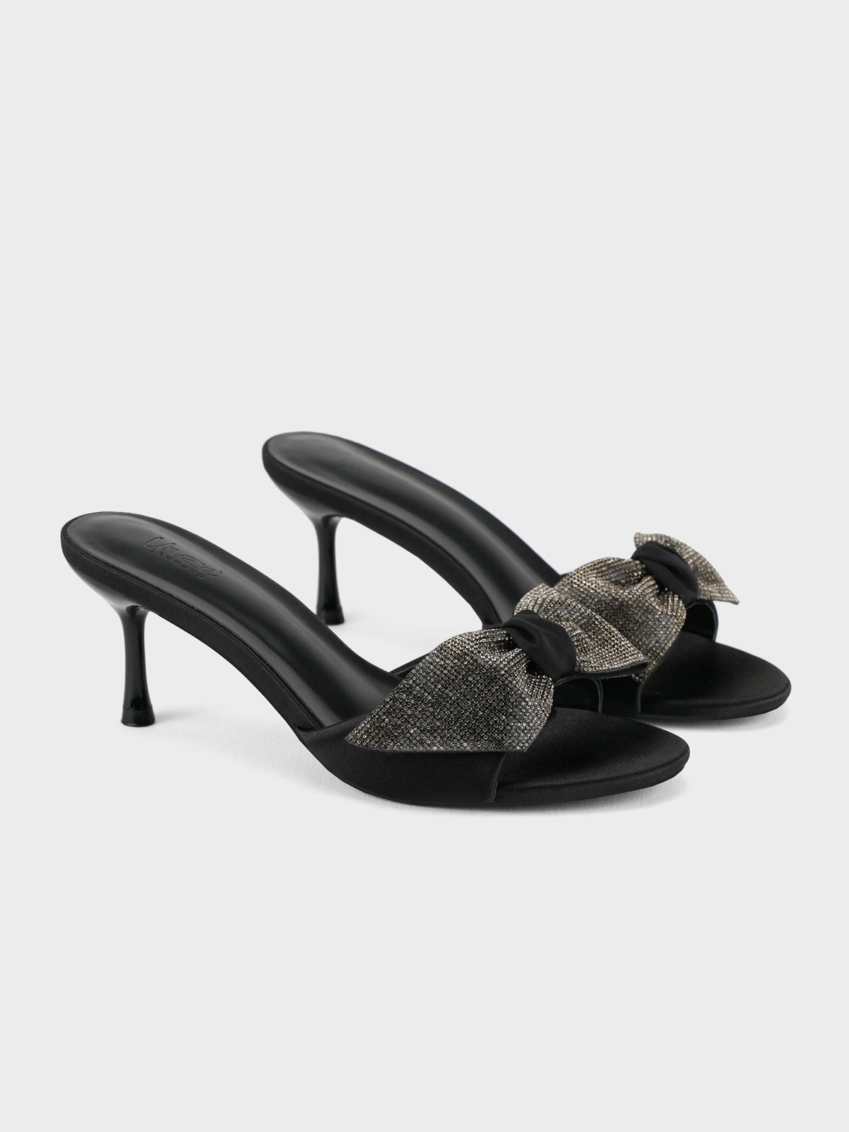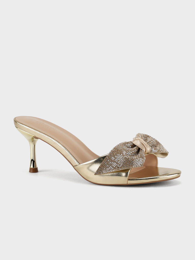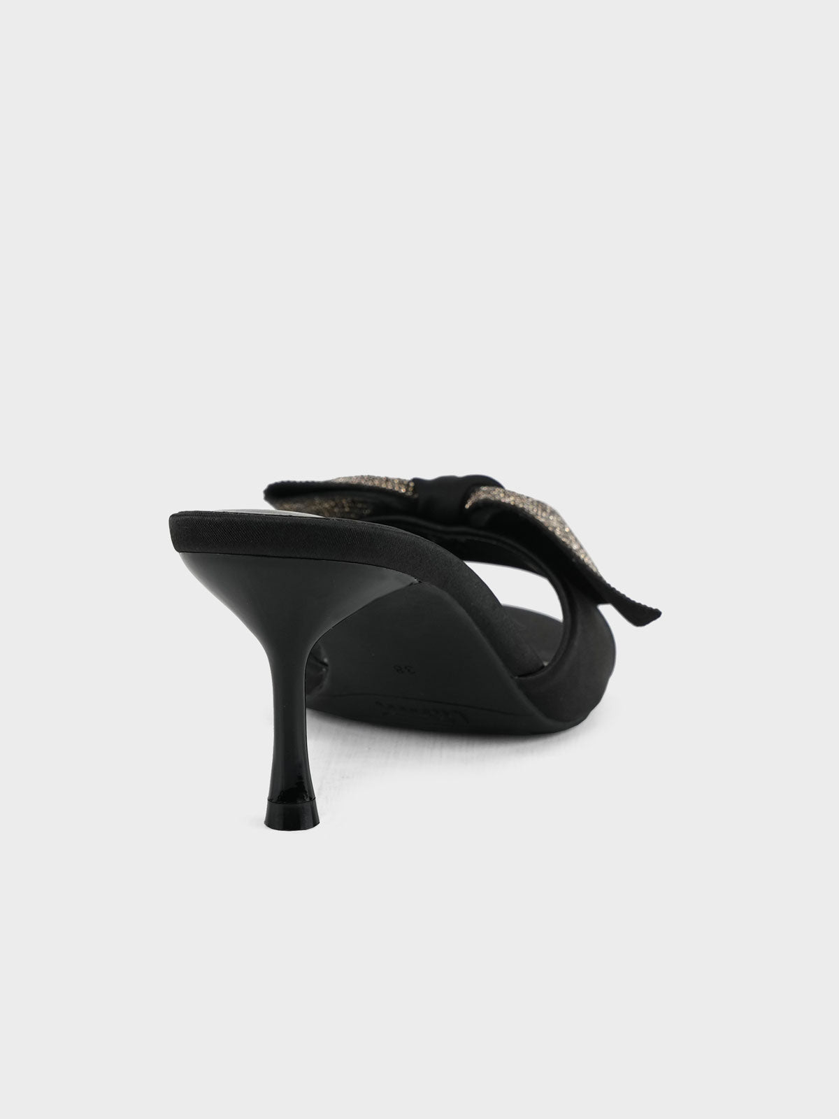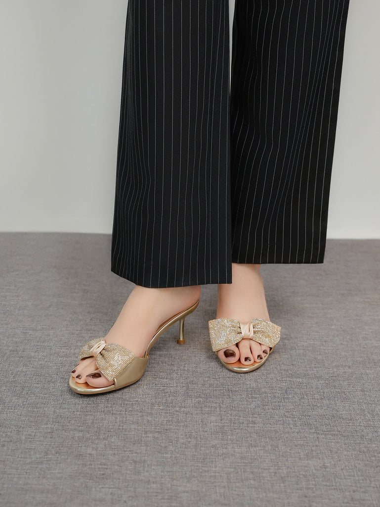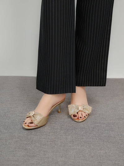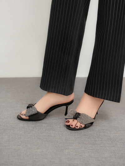 Shine bright with these pencil heel evening sandals featuring rhinestone-adorned bow detailing and an elegant open-toe design, perfect for special occasions. Easy slip on wearing makes it quickly accessible.