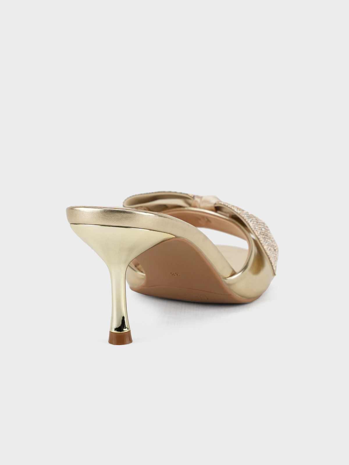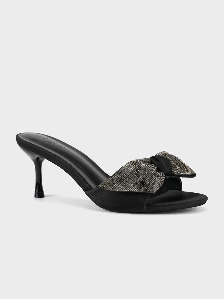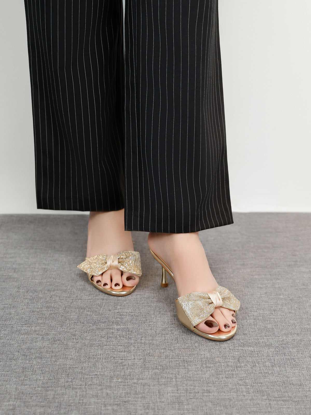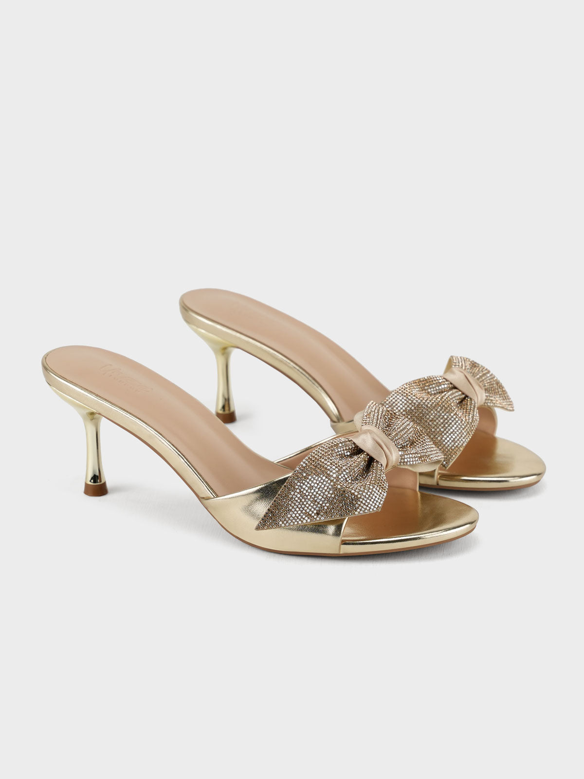 Shine bright with these pencil heel evening sandals featuring rhinestone-adorned bow detailing and an elegant open-toe design, perfect for special occasions. Easy slip on wearing makes it quickly accessible.