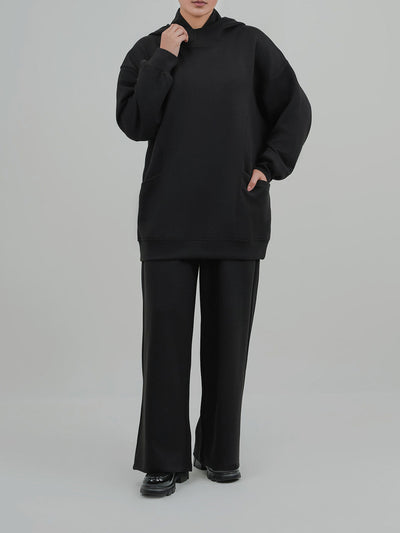 Upgrade your winter wardrobe with this stylish women's fleece co-ord set. Featuring a cozy high-neck top with roomy front pockets and matching wide-leg trousers, this set blends warmth with effortless style.