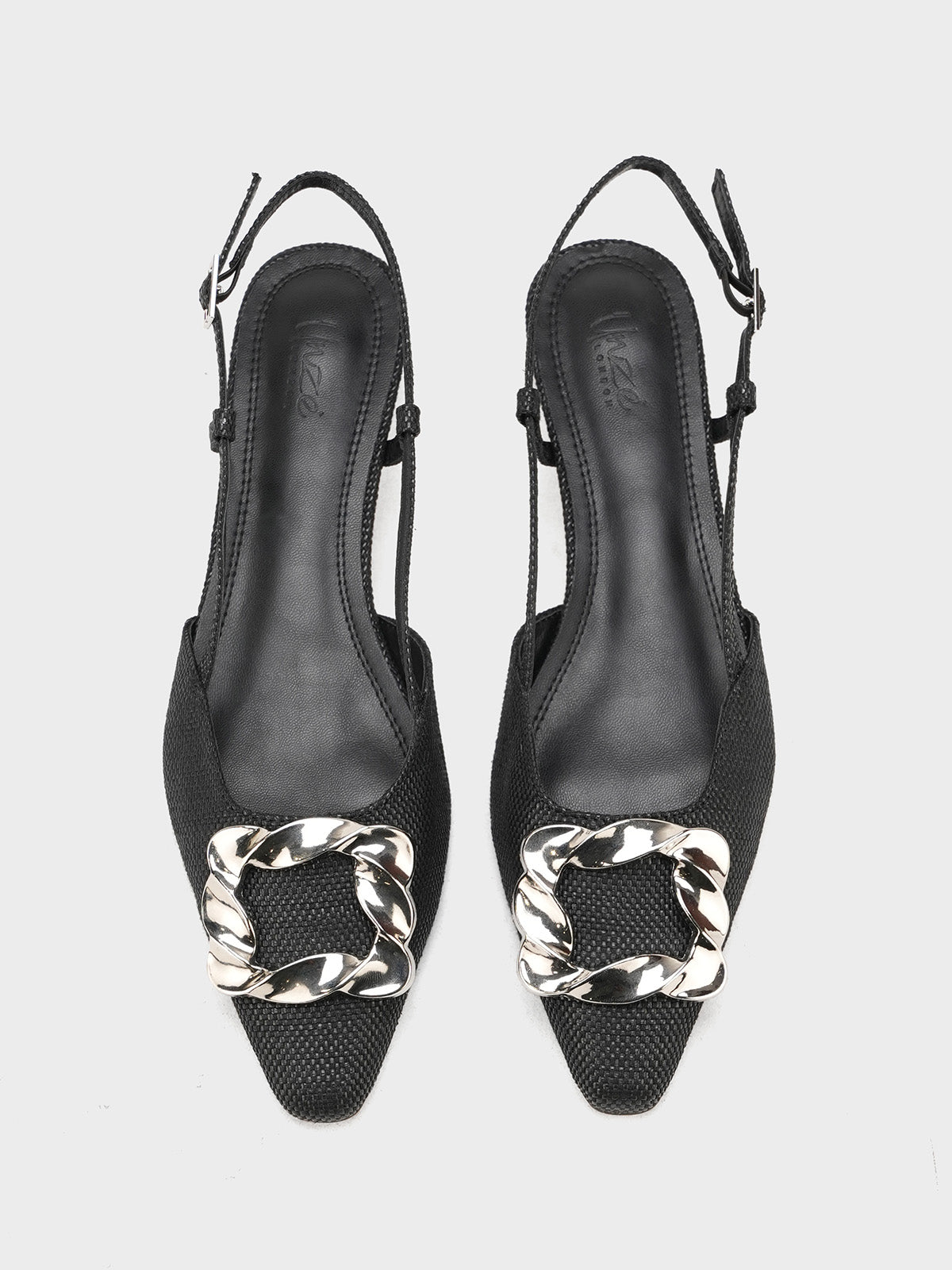 Make a statement with these elegant women’s buckle sandals, designed to add instant glamour to any outfit. Featuring a pointed toe and eye-catching metallic buckle embellishments, the low kitten heel ensures comfort while maintaining a graceful silhouette.