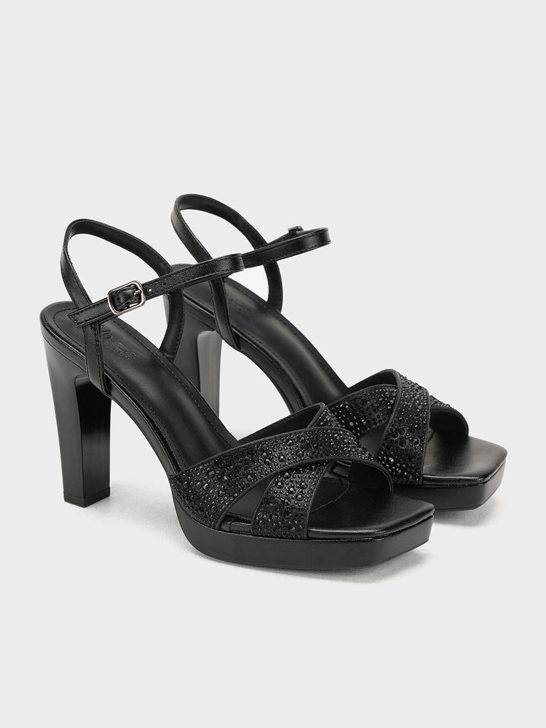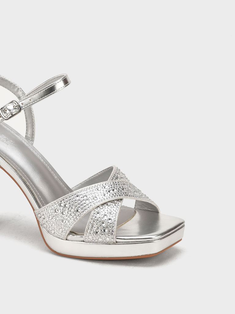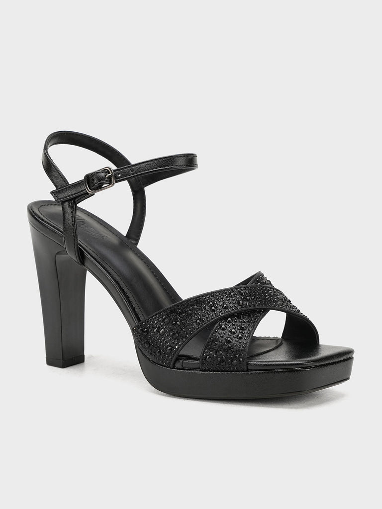 Add a touch of sparkle to your step with these glamorous block heel sandals. Designed with shimmering cross straps and a secure ankle buckle, these heels offer a chic blend of style and comfort. The block heel ensures all-day ease without compromising on fashion.