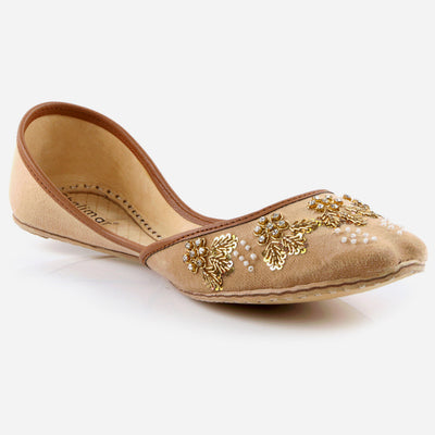 Conjure a melodious starry night with these Rhinestone embellished Shalimar Shoes Indian Flat Leather Khussa. This year our new Indian Khussa collection is fully decorated. The fully diamante upper puts shimmer and shine in each step while the silhouette is simple, slender and perfectly sweet. These shoes are truly stylish piece made by expert craftsman. It’s beautifully embellished with pearls and crystals to give formal look. And padded in-socks add comfort in it. These Mojaris can be worn either left or right, doesn’t make any difference