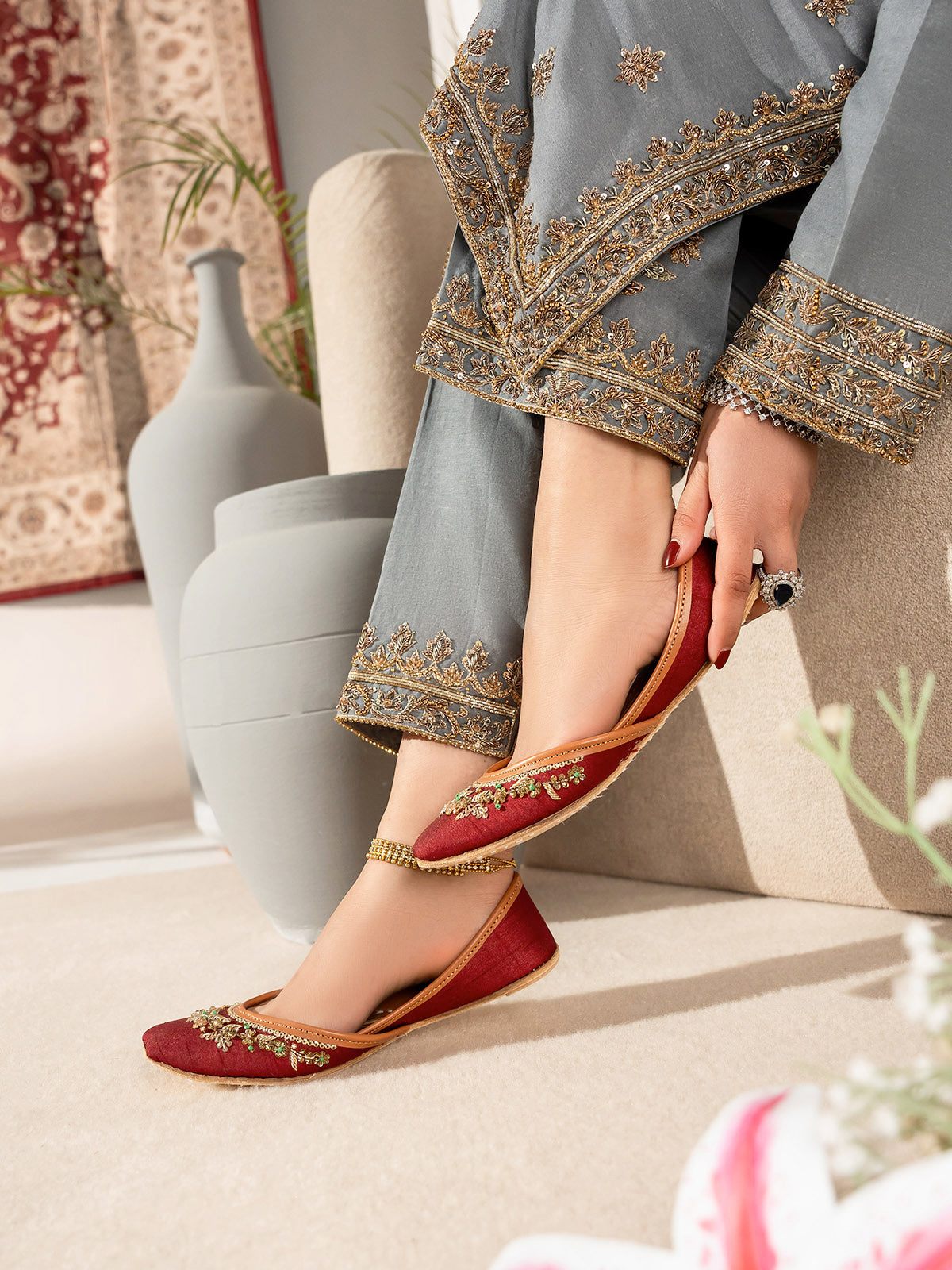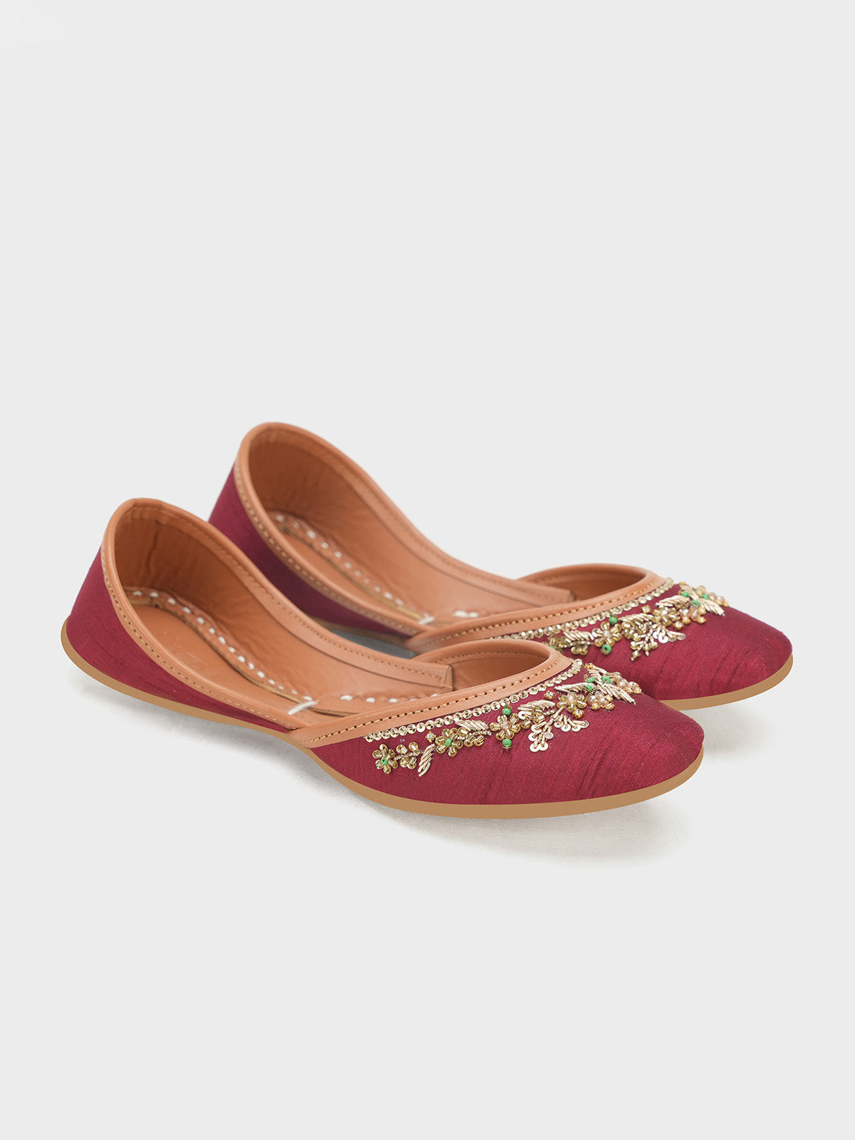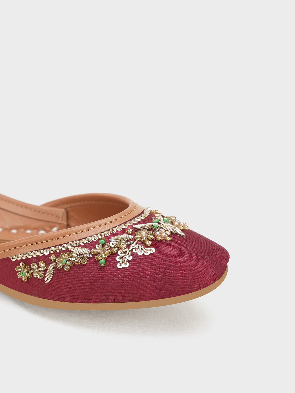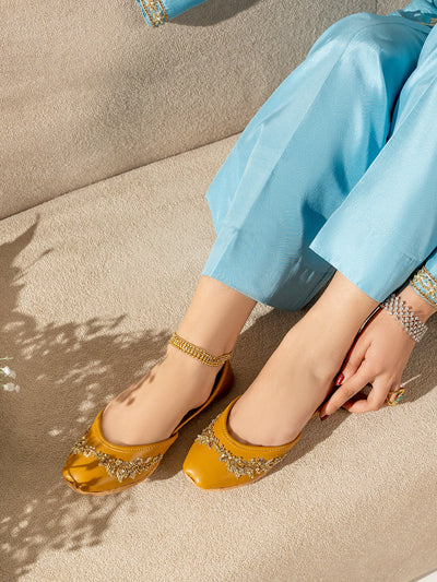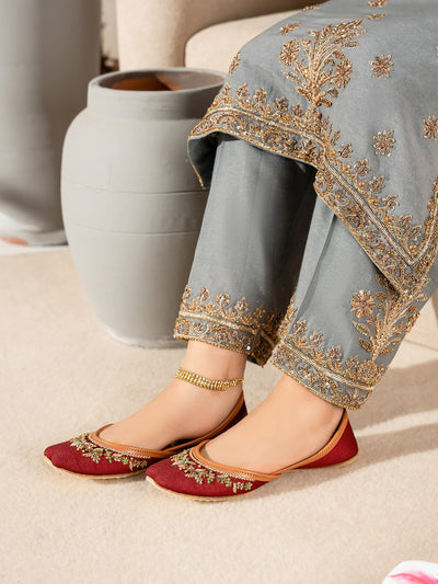 Add a touch of luxury to your look with this beautifully handcrafted women khussa featuring elegant beadwork and delicate pearl embellishments. The intricate detailing gives it a rich, traditional appeal, perfect for festive and formal occasions. Made with soft inner padding and a flexible sole.