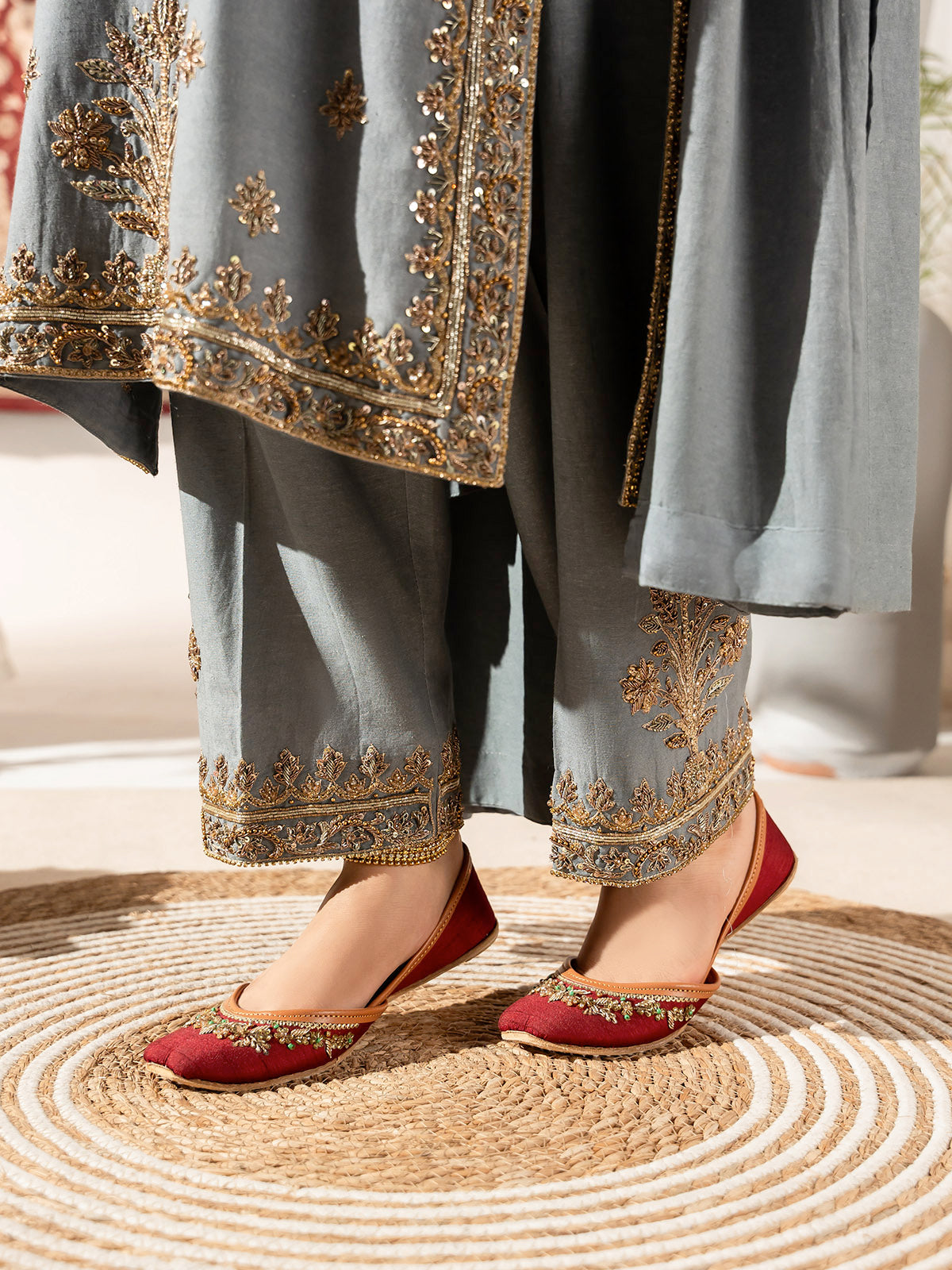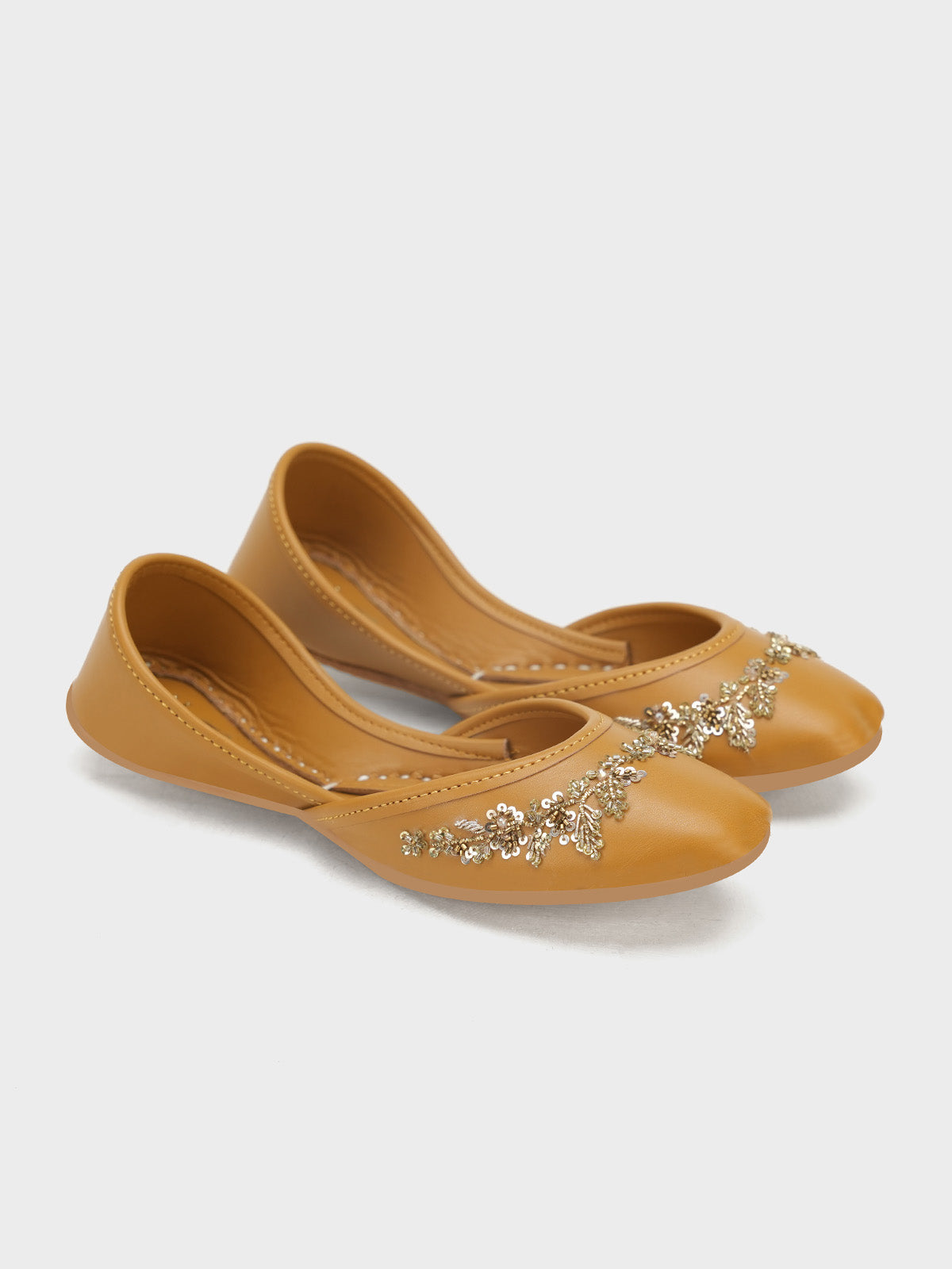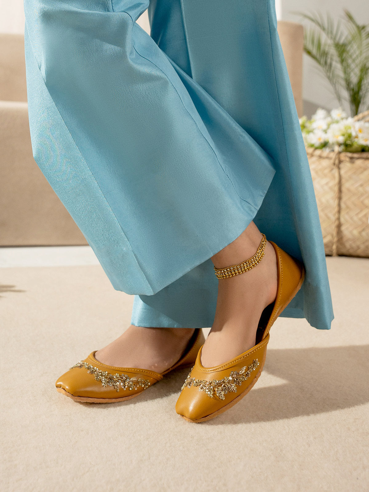 Add a touch of luxury to your look with this beautifully handcrafted women khussa featuring elegant beadwork and delicate pearl embellishments. The intricate detailing gives it a rich, traditional appeal, perfect for festive and formal occasions. Made with soft inner padding and a flexible sole.