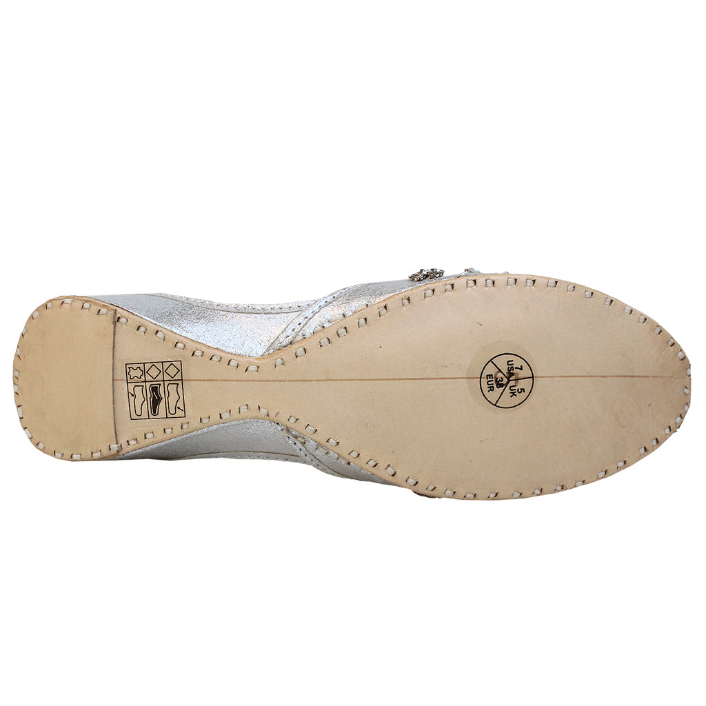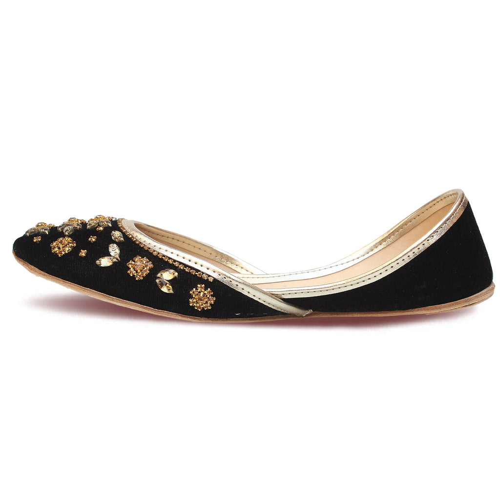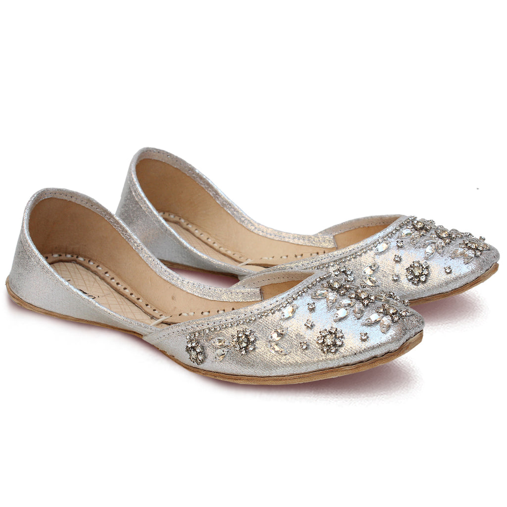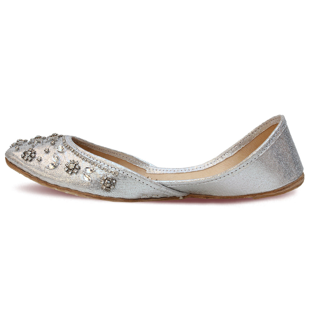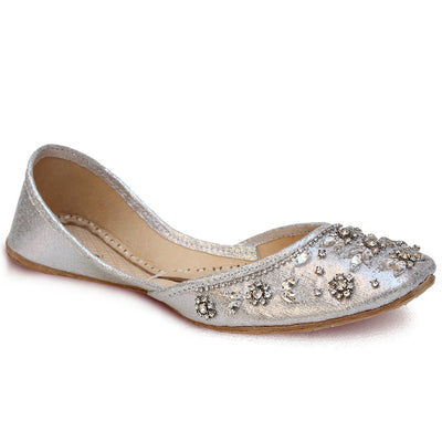Grab these an exquisite pair of Khussa pumps adorned with intricate beadwork and zari embroidery throughout. These stunning pumps feature a convenient slip-on design and a rounded toe, ensuring effortless wearability. The flat sole provides utmost comfort, while the embellishments of beads and zari work add a touch of elegance.