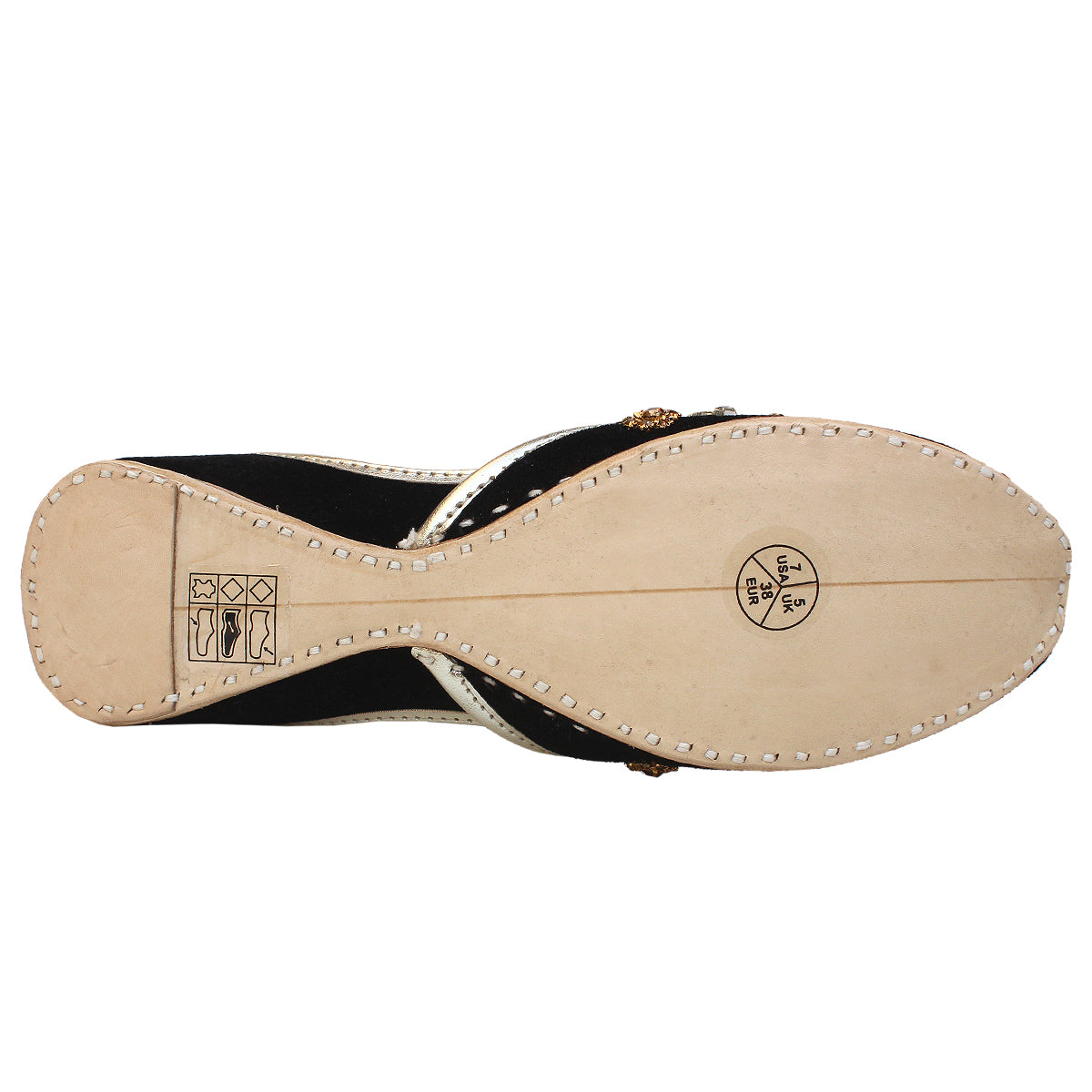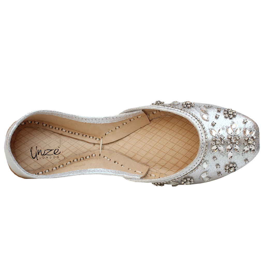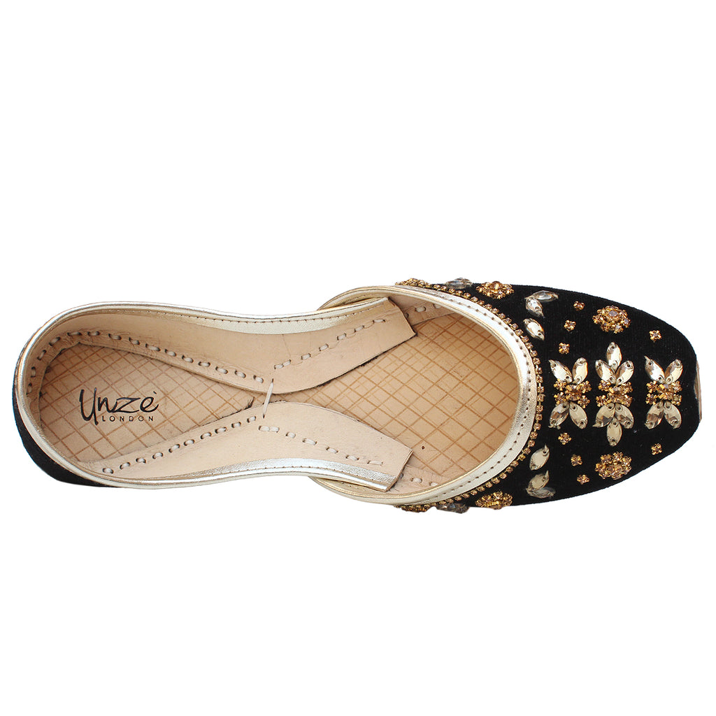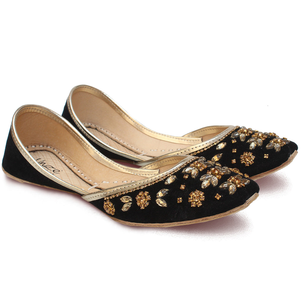 Grab these an exquisite pair of Khussa pumps adorned with intricate beadwork and zari embroidery throughout. These stunning pumps feature a convenient slip-on design and a rounded toe, ensuring effortless wearability. The flat sole provides utmost comfort, while the embellishments of beads and zari work add a touch of elegance.