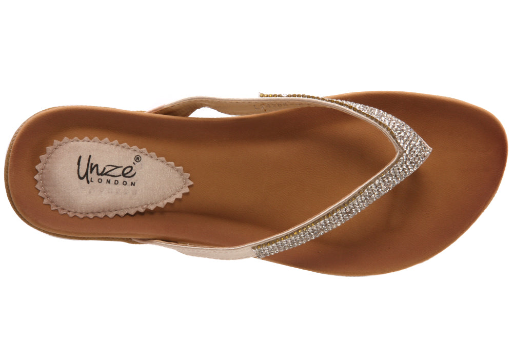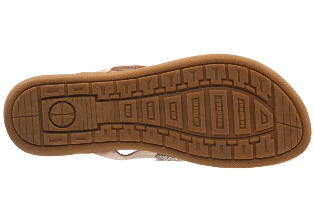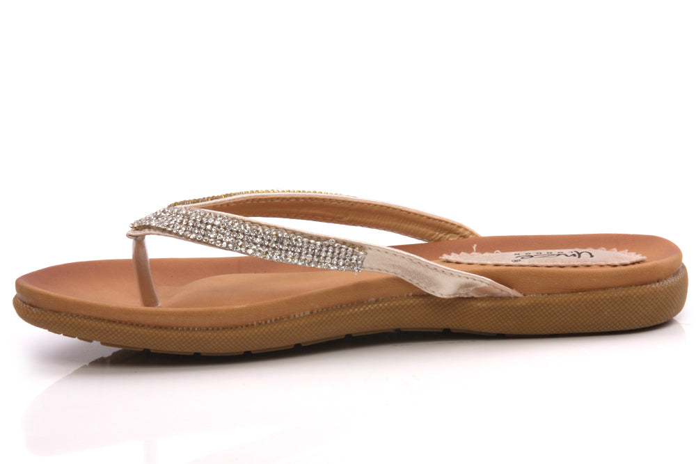 Slip into these summer open toe adorned slippers and relaxed in weekends. Thong construction with rubber sole and slide in design. Style No: L24285 Colour: Gold