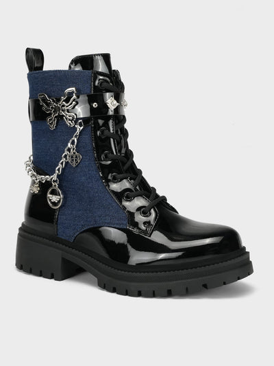 Women's Smooth Lace Up Boots. Crafted from premium patent leather, they boast a scripted heel-loop and sturdy metal eyelets for durability and comfort. Additionally a chain decoration with some metallic studs detailing gives ultimate charm.